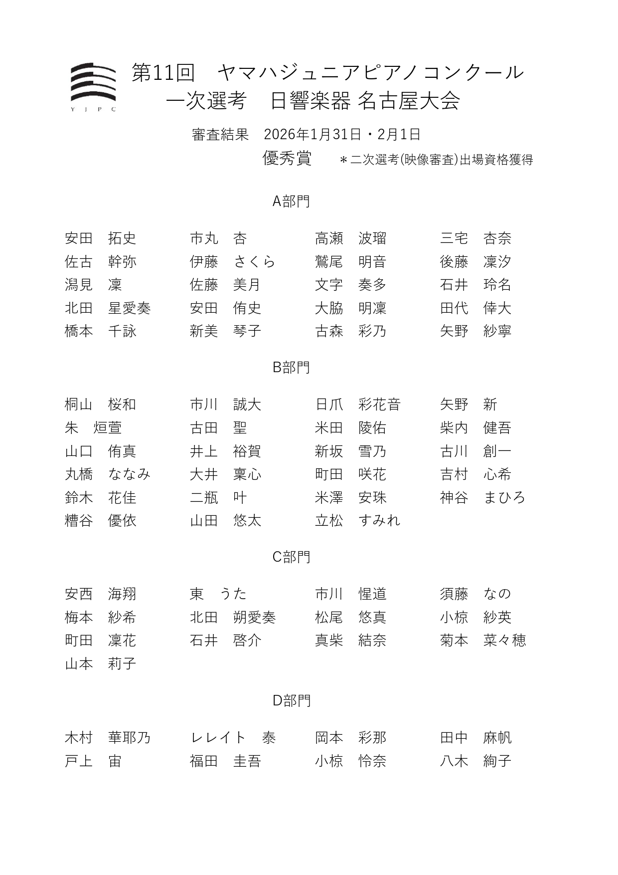 【審査結果】第11回YJPC 一次選考 日響楽器 名古屋大会 2026年2月1日 池下店、藤が丘店、東山店 『第11回ヤマハジュニアピアノコンクール 一次選考 日響楽器 名古屋大会』の審査結果は次の通りです。