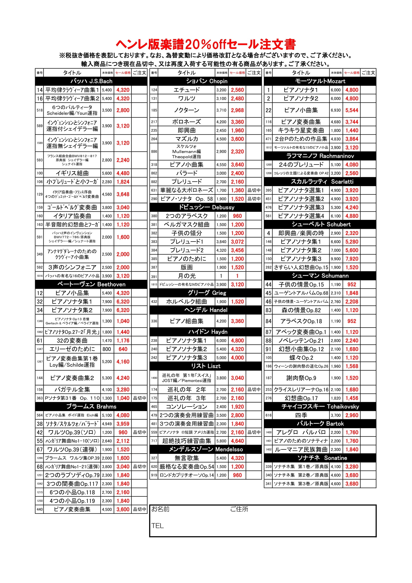 日頃のご愛顧に感謝いたしまして、上記期間中 輸入楽譜ヘンレ版セールを20%OFFさせていただきます。
