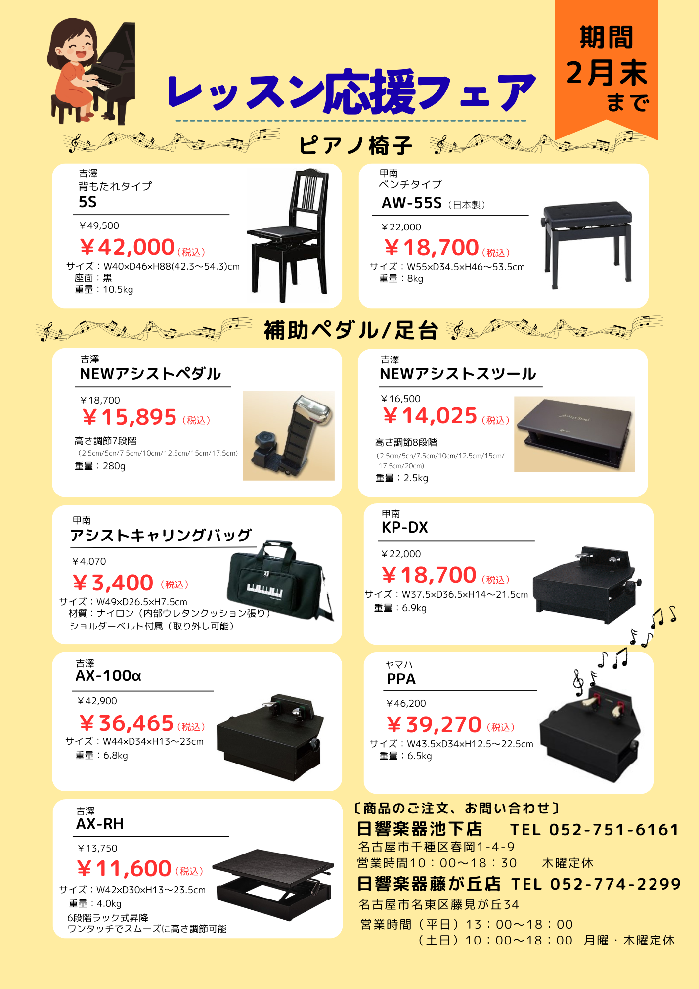 2月末まで レッスン応援フェア☆ピアノ椅子、補助ペダルセール