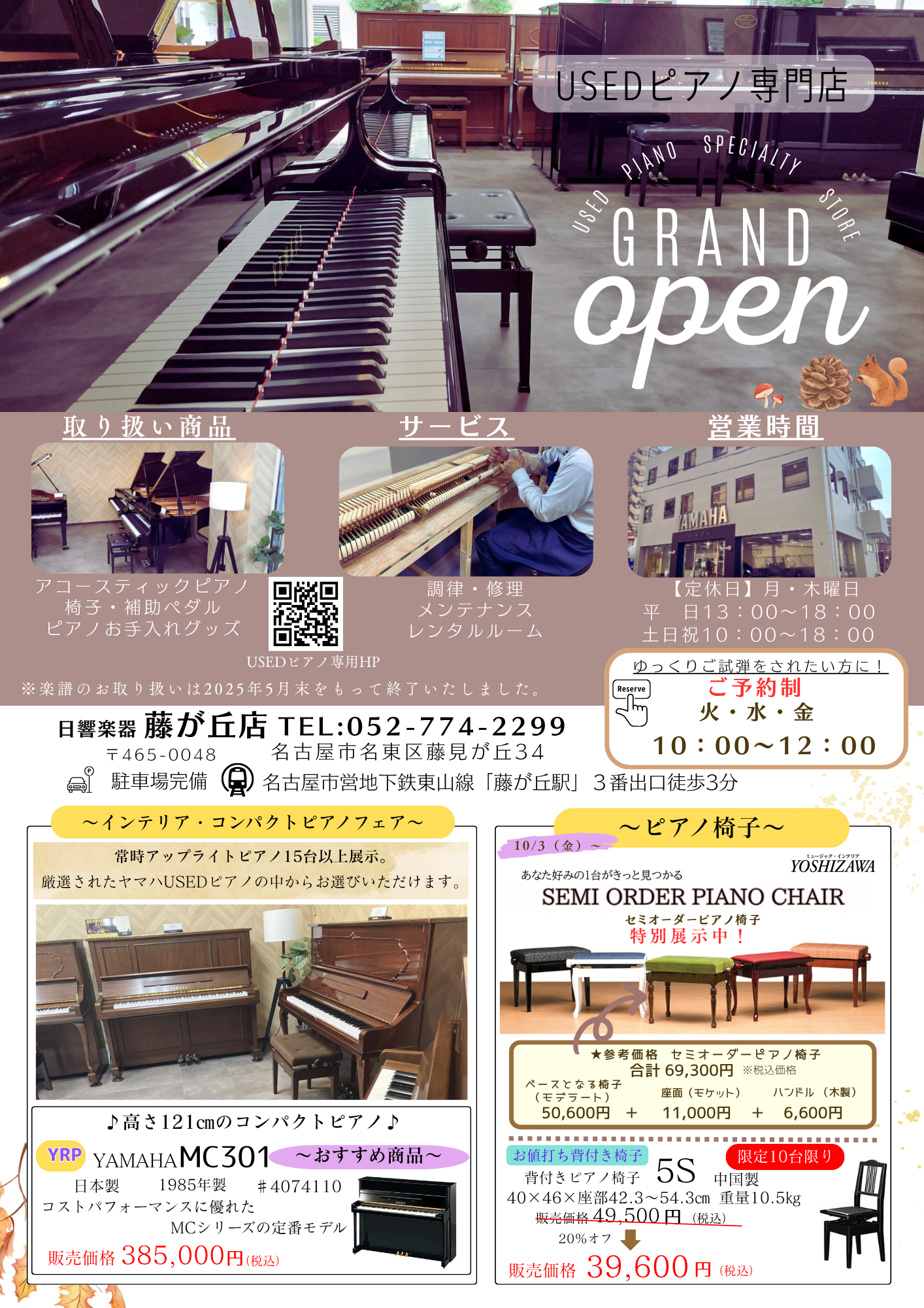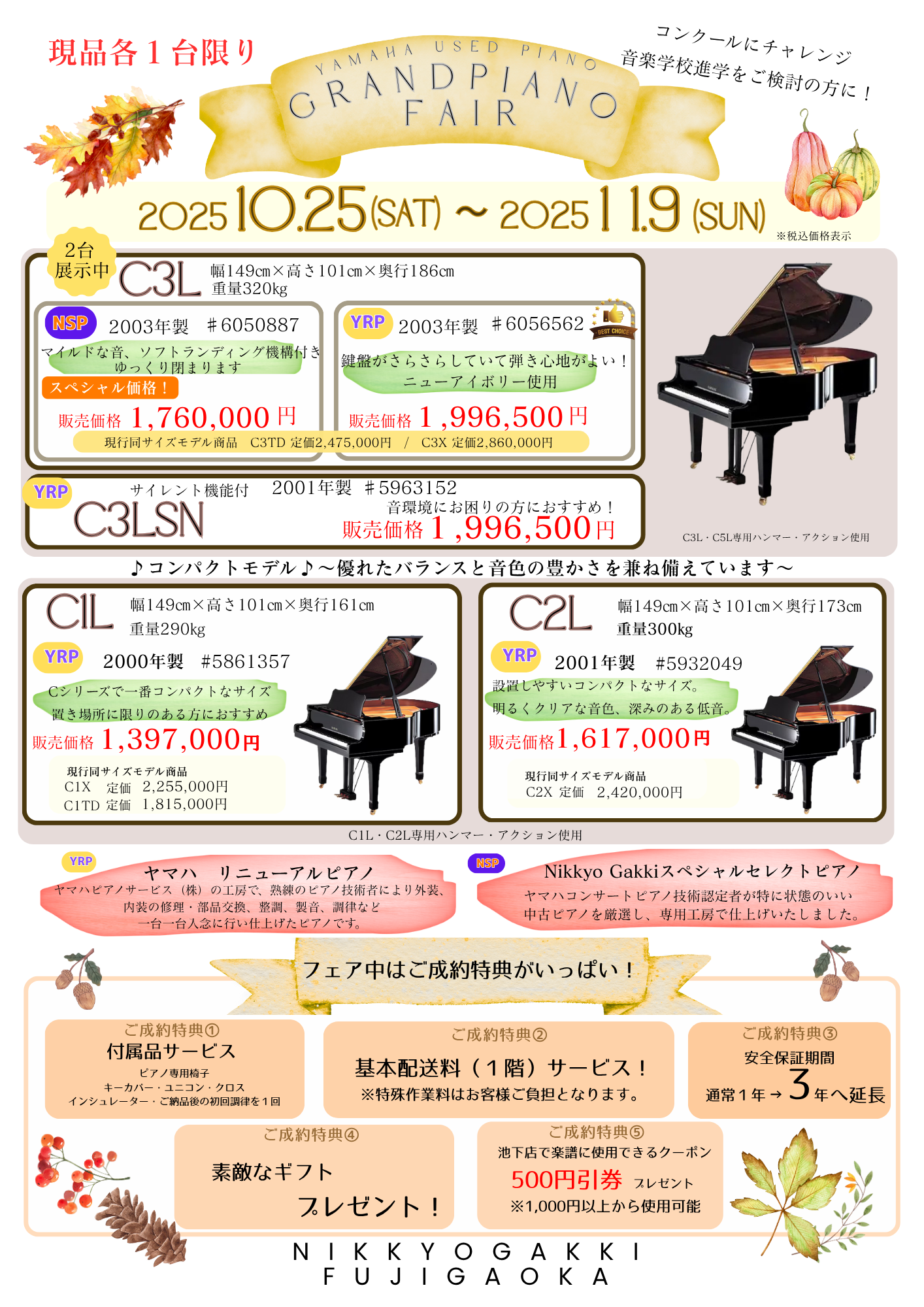 【USEDピアノ専門店 藤が丘店】グランドピアノフェア 10/25(土)~11/9(日)